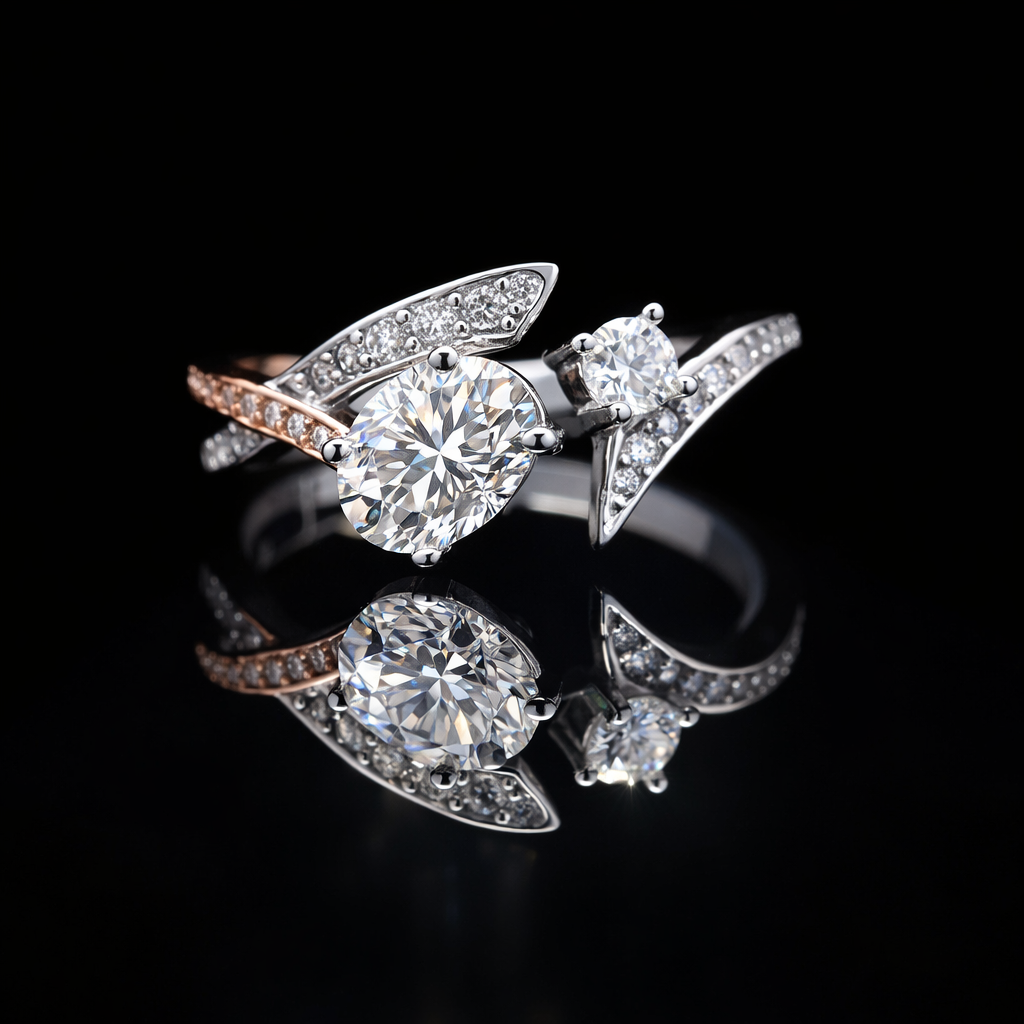 Set in premium polished silver with subtle rose-gold accents, the design blends contemporary luxury with timeless charm. The precision-cut moissanite stones ensure unmatched sparkle, making it a perfect choice for special occasions, proposals, or everyday elegance.