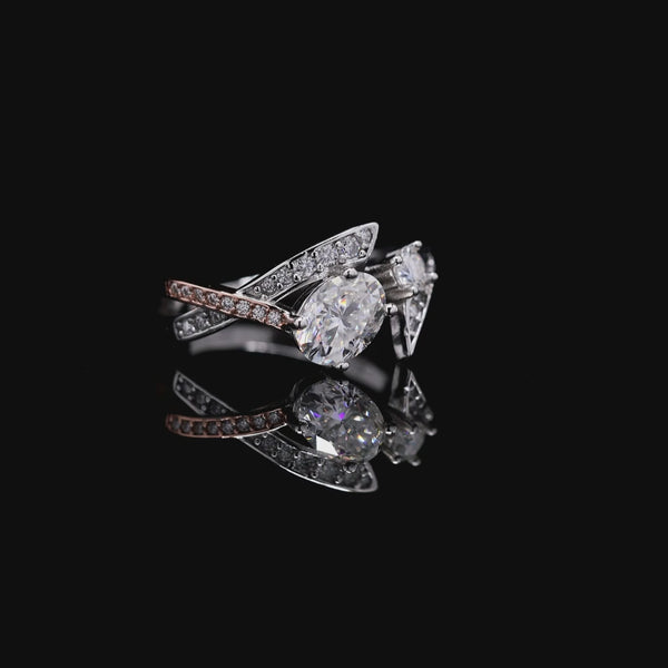 Experience brilliance beyond diamonds with this elegant moissanite dual-stone ring, crafted to perfection for modern sophistication. Designed with a unique intertwining band, this ring features two dazzling round-cut moissanite stones that radiate exceptional fire and clarity.