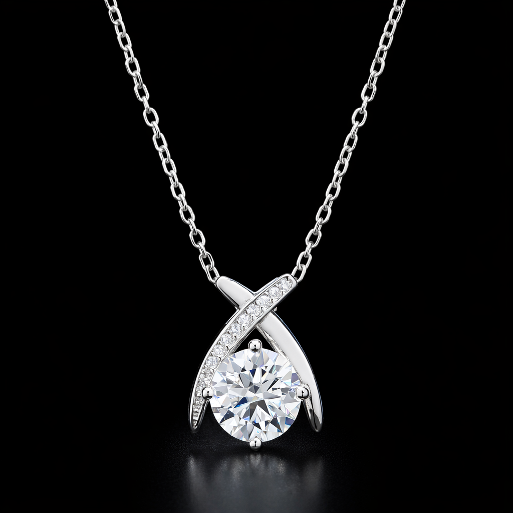 This refined diamond twist pendant necklace is designed to add effortless elegance to any look. Crafted with a sleek silver-tone finish, the pendant features an intertwined, contemporary design that gracefully embraces a brilliant-cut central diamond. The delicate chain sits beautifully on the neckline, while the compact pendant size ensures a subtle yet striking sparkle. Perfect for everyday wear or special occasions, this necklace blends modern design with timeless sophistication, making it an ideal gift or a versatile addition to your jewelry collection.