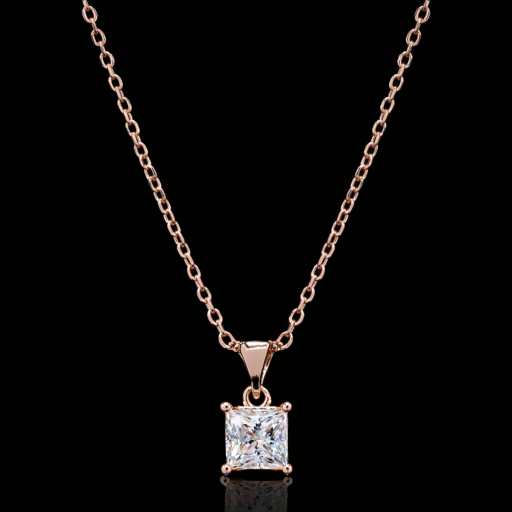 A timeless expression of elegance, this rose gold pendant necklace features a delicately crafted square-cut diamond that captures light with every movement. Designed to sit gracefully on the neckline, the minimal yet luxurious pendant adds effortless sophistication to both everyday wear and special occasions. Finished with a fine rose gold chain, this piece blends modern charm with classic beauty perfect for those who appreciate subtle luxury and refined craftsmanship.