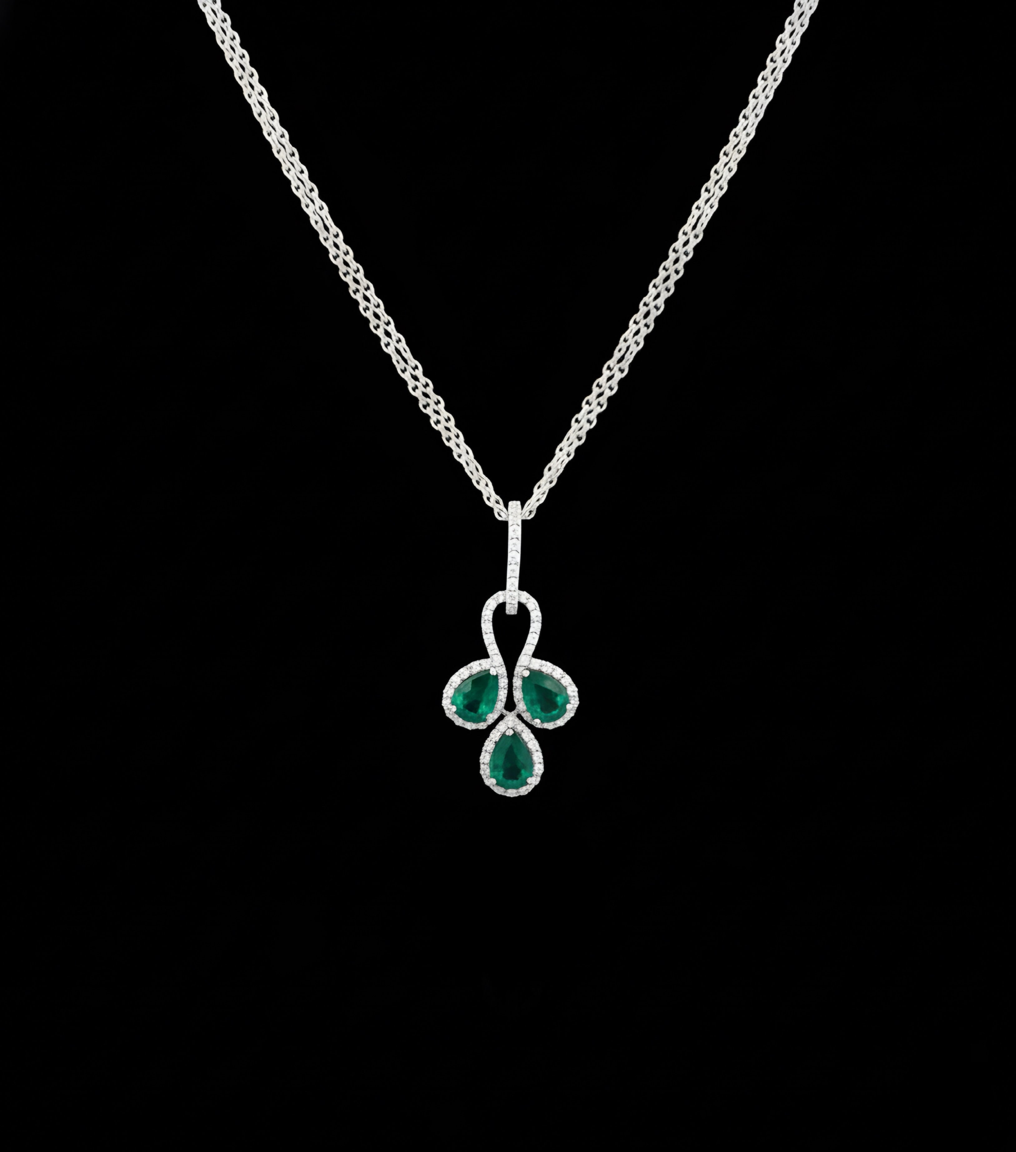 Discover refined elegance with this exquisitely crafted emerald trinity halo silver pendant, thoughtfully designed to celebrate balance, brilliance, and timeless beauty. Showcasing three luminous pear-shaped emerald-green gemstones, the pendant captivates with its rich colour, depth, and graceful symmetry.