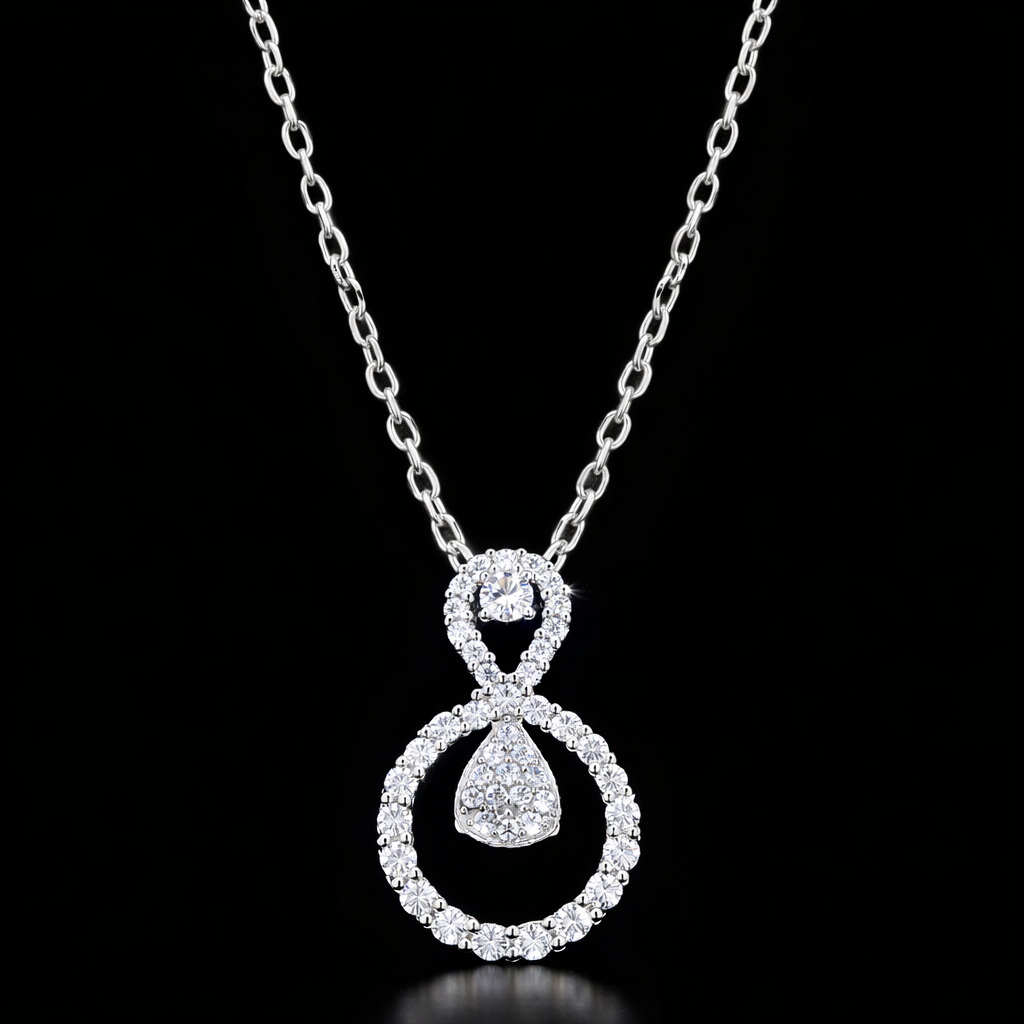At its heart, a delicately suspended pear-shaped diamond cluster adds depth and movement, enhancing the pendant’s graceful form. Each diamond is precisely cut and flawlessly set to ensure superior brilliance, clarity, and light reflection. The fine sterling silver chain sits effortlessly on the neckline, offering a lightweight yet luxurious feel ideal for both daily wear and special occasions.